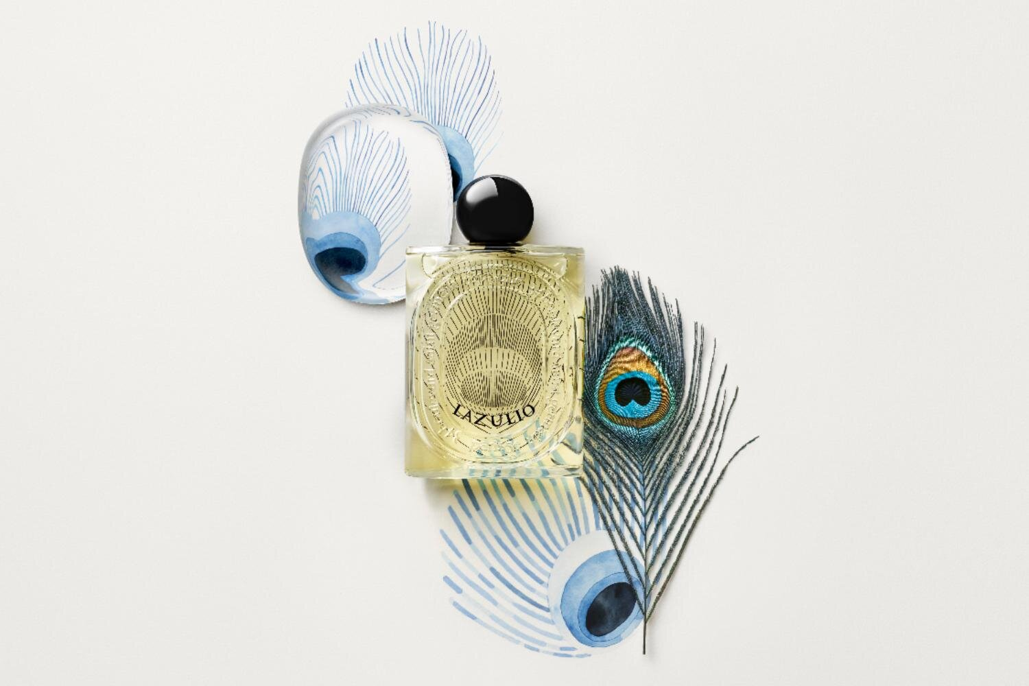 ボトルはディプティック創業初期のデザインから着想を得たクラシックなフォルムである。透明なガラスにはメゾンを象徴するオーバルが浮き彫りになり、背面には“クジャクの羽”のイラストが刻まれている。さらに、外箱にもブルーの水彩画で描かれた羽のモチーフが施され、芸術的な仕上がりとなっている。
