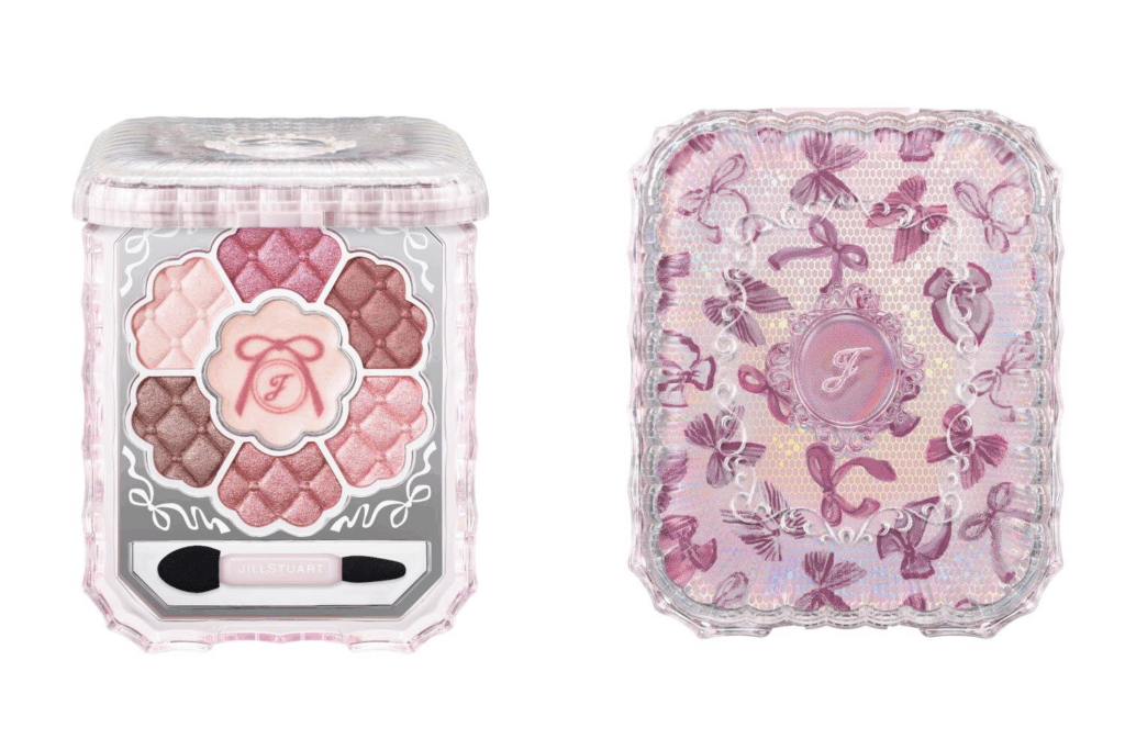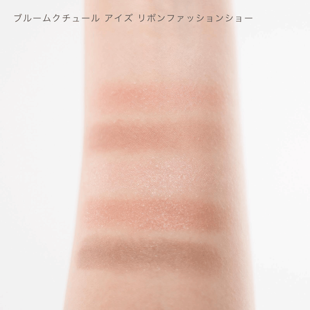 セットの中でも注目は「ブルームクチュール アイズ リボンファッションショー」。淡いペールピンクから深みのあるベリーピンクまで7色を揃え、透明感のある発色で重ねても濁りにくいのが特徴だ。オーロラカラーとリボン柄を組み合わせたコンパクトは、ランウェイの華やかなドレスをイメージしている。